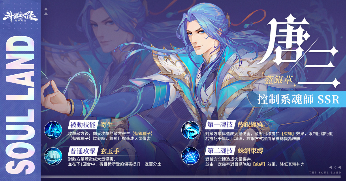 唐三作為史萊克七怪的精神領袖,在鬥魂場上一直如「軍師」般冷靜與機智。依靠著藍銀草進可攻、退可控的特性,既可對遠處的敵人施加瞬時控制,也能靈活走位,解救隊友於水火之中。
