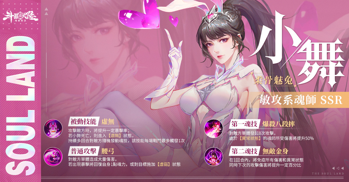由十萬年魂獸幻化成人形的小舞,看起來是柔弱可愛的小女生,實則是一個活潑且敢愛敢恨的小御姐。在遊戲中,小舞更適合對敵方單體進行爆發輸出,「腰弓」和「爆殺八段摔」都是她的經典招式。
