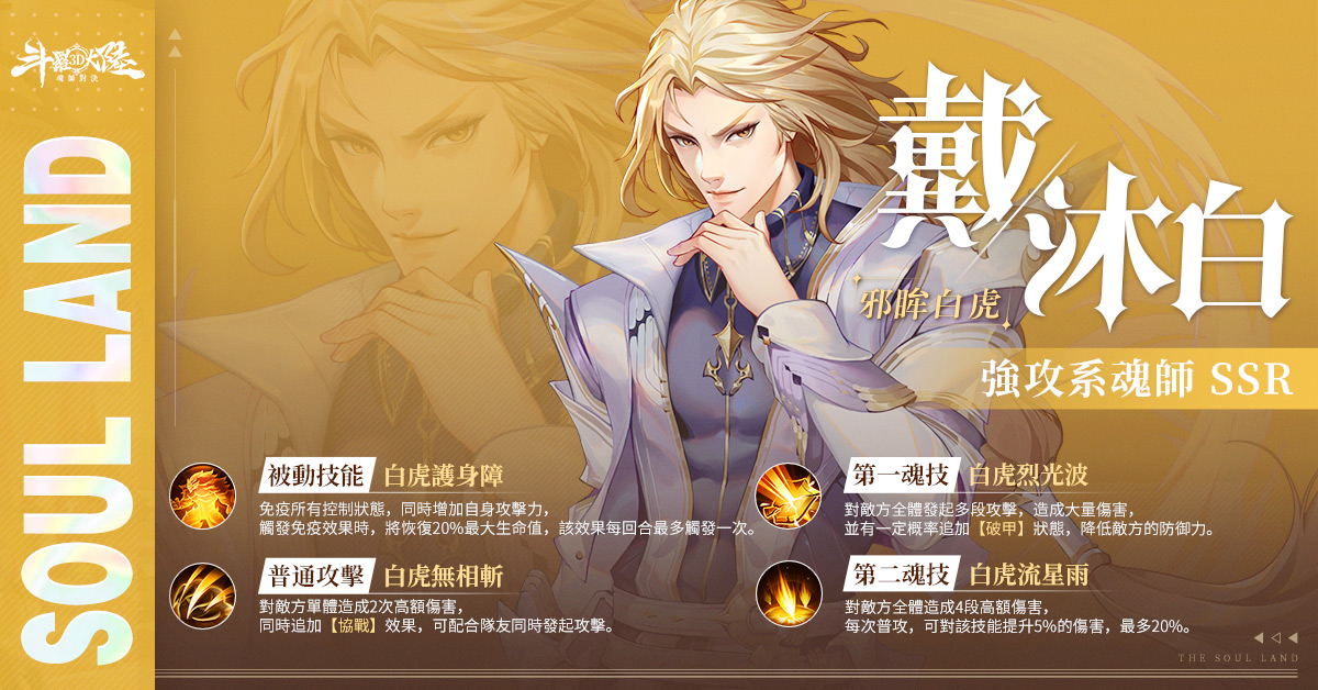 作為星羅帝國的三皇子,戴沐白有著與生俱來的王者之氣。在強攻系魂師中,其邪眸白虎是獸武魂中的佼佼者。