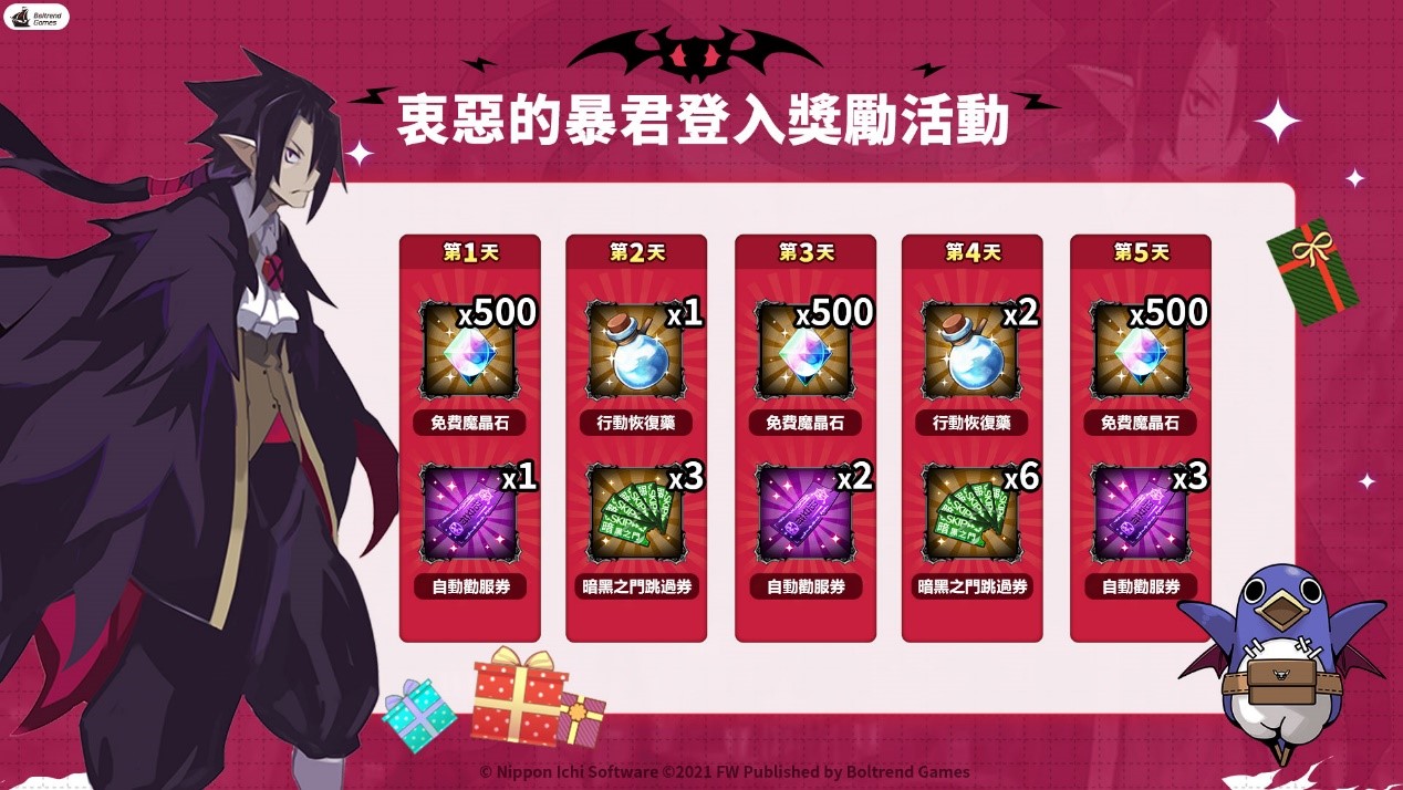 香港商 Boltrend Games 旗下代理由日本遊戲廠商 ForwardWorks、Nippon Ichi Software, Inc. 共同開發的史上最兇日系 RPG《魔界戰記 DISGAEA RPG》繁中版今(28)日宣佈,全新改版活動──「衷惡的暴君」震撼降臨,擁有強大力量的吸血鬼角色「暴君瓦爾巴特傑」登場,不僅如此官方還加碼送超好康登入大禮,魔王們,一定不能錯過這款獨具魅力的匠心之作,趕緊下載《魔界戰記 DISGAEA RPG》,挑戰成為最強魔王!