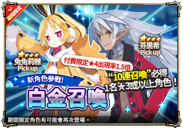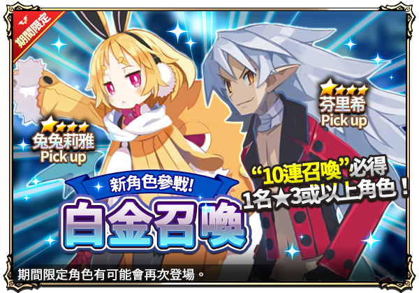 →付費限定卡池:每10抽可獲得10點【兔希徽章】,累積對應的【兔希徽章】可在【兌換所】中保底兌換角色【兔兔莉雅、芬里希】及【魔改造專屬普利尼、活動關卡跳過券】等材料哦!