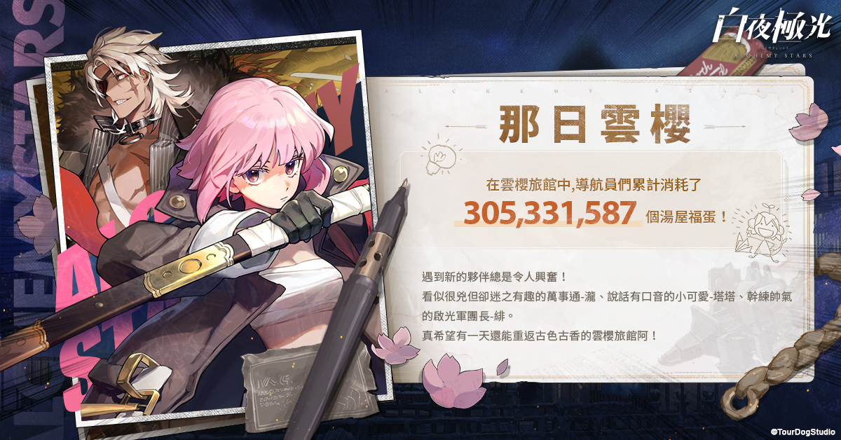 《白夜極光》於9/16上線,在眾多玩家的熱烈支持下,短短一個月即突破200萬人次註冊的佳績!為祝賀此份榮耀,官方除了以實際行動回應玩家們的支持,也在迎來滿月之際,為大家回顧遊戲大事件;還記得第一次走出臨空者號時的不安與興奮嗎?在雲櫻旅館中,導航員們累計消耗了305,331,587個湯屋福蛋;在赤眼谷裡,導航員們幫助伊芙戰勝了恐懼、痛苦、憤怒達329,852次等,還有踴躍參與粉絲團活動的導航員們,那些超實用的攻略、同人創作、爆笑的cosplay巧思、及各種評論和建議,都是鼓勵《白夜極光》不斷前進的動力。