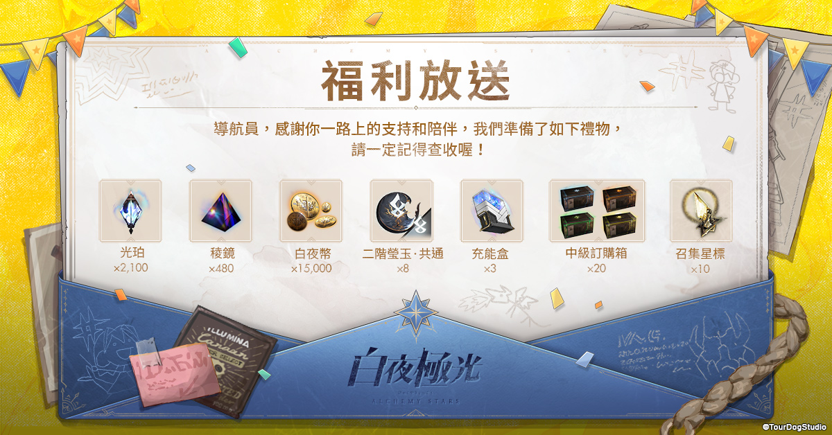 此外官方為感謝導航員的支持,特地舉辦了福利滿滿的慶典活動,在滿月當天(10/15)登入即可獲得召集星標10個,並在10/16發放2,000光珀,慶典活動期間也將連續8天,天天60個稜鏡大放送,另外還有累積登入獎勵、限時滿月召集箱等,商店也將上架包含了100光珀及3個充能盒的免費充能禮包,與包含了15,000白夜幣、8個二階瑩玉.共通、20個中級訂購箱的免費進階禮包,豐盛超值的獎勵要送給導航員們一同歡慶滿月。