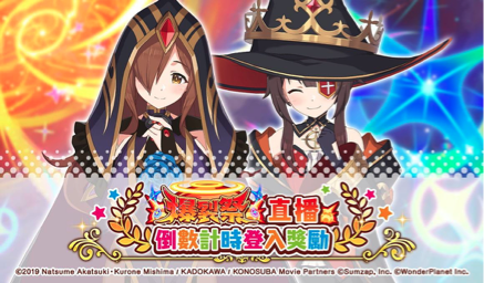本次為紀念爆裂祭,將舉辦「爆裂祭直播倒數計時登入獎勵」、「爆裂祭倒數惠惠應援任務」。另外還有梅露首次參戰的襲來活動「肌肉金剛襲來!〜手忙腳亂育嬰記〜」、「梅露參戰!雷電女孩轉蛋」正熱烈舉辦中!詳情請鎖定Facebook官方粉絲團喔!