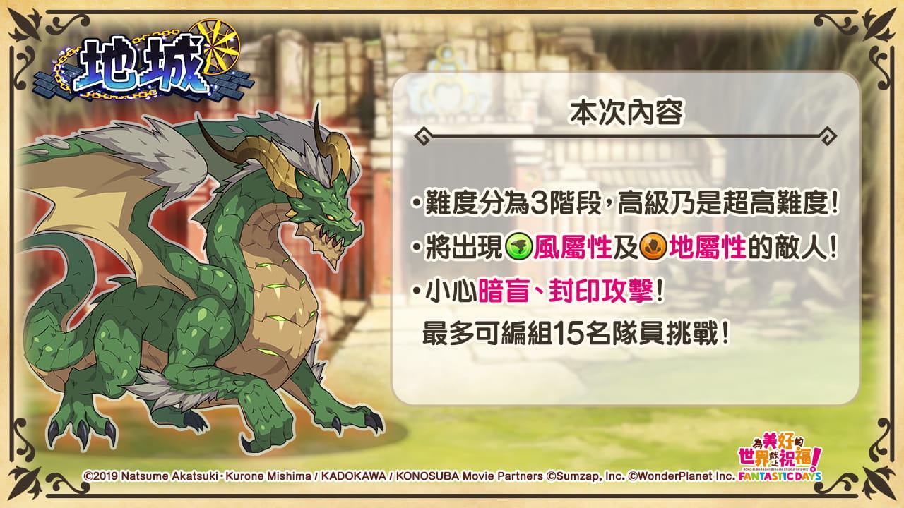 2021年10月21日(四)起新戰鬥遊玩內容「地城」也如火如荼舉辦中。本次的頭目將由「疾風巨龍」登場!通關後還有機會獲取阿克西斯獎牌等貴重稀有道具。現在就召集隊員,配合關卡編組隊伍,努力稱霸地城吧!