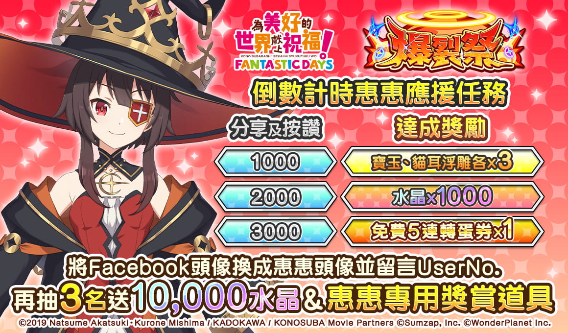 為紀念爆裂祭,將舉辦官方Facebook限定分享&按讚活動。自2021年10月23日(六)起,將公開的指定貼文分享+按讚,合計數字超過一定值後將贈送水晶或免費5連轉蛋券給全體玩家。不只如此,還會抽選3位贈送10,000水晶和惠惠專用獎賞道具!參加辦法及詳細請至美好世界FD官方Facebook確認喔!
