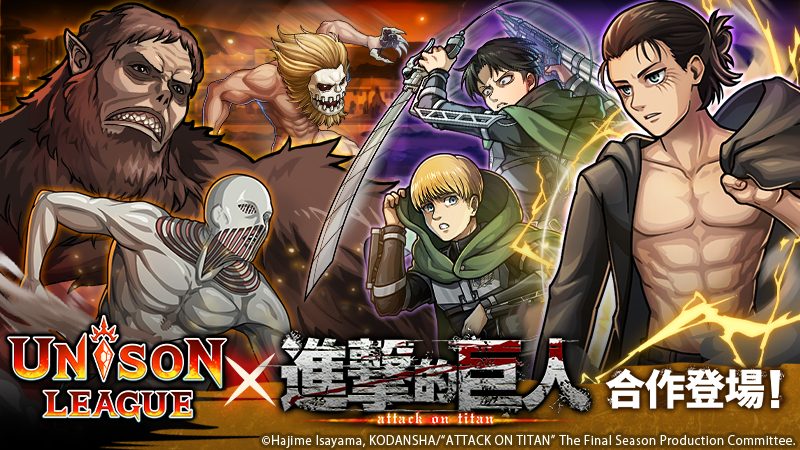 新感覺即時戰鬥RPG《UNISON LEAGUE》與 電視動畫《進擊的巨人》合作後篇開始! The Final Season中的阿爾敏、里維、漢吉全新登場! 活動中可獲得「野獸巨人」與「戰鎚巨人」!