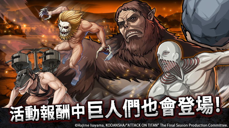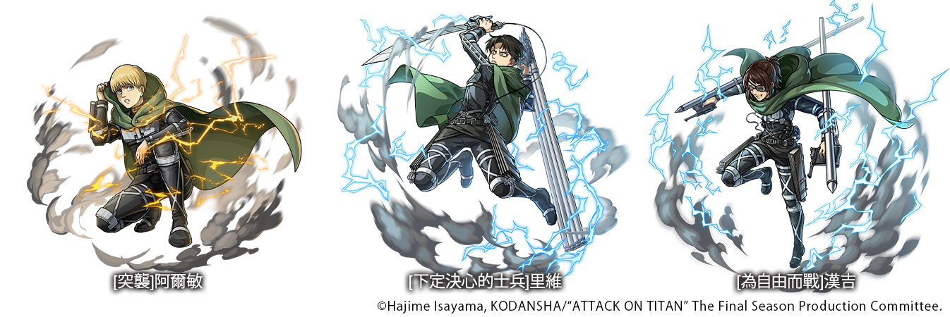 後半階段的活動裡,「阿爾敏」、「里維」、「漢吉」等新合作角色將以The Final Season的形象登場!除此之外,「野獸巨人」、「戰鎚巨人」、「車力巨人」、「顎巨人」也會初次於遊戲內登場。