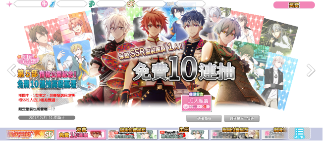 歷時2年的企劃製作,玩家引頸期盼的《IDOLiSH7-偶像星願-》第5部劇情即將登場!為紀念情報公開,遊戲內限時舉辦保證獲得SSR1人的免費10連抽高級甄選活動!活動時間為12/7(二) 11:00 ~ 12/31(五) 10:59止,期間限定1次。除固定高級甄選的服裝外,SSR[REUNION]服裝的團員也將登場!敬請不要錯過了!