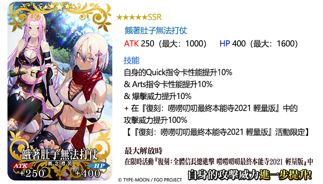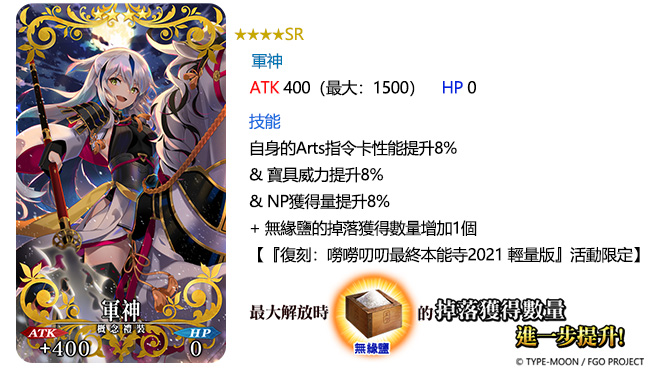 與限時活動同步開放的「復刻:嘮嘮叨叨最終本能寺2021 PICK UP召喚」中,「★5(SSR)魔王信長(織田信長)」、「★5(SSR)沖田總司〔Alter〕」及「★5(SSR)李書文〔Assassin〕」等3騎從者,將以每日變更的方式登場。而「★4(SR)織田信長〔Berserker〕」及「★3(R)森長可」等2騎從者,則召喚期間每日現身。