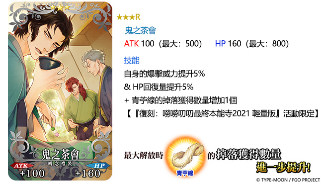 想有效提升「復刻:全體信長總進擊 嘮嘮叨叨最終本能寺2021 輕量版」的活動道具掉落數量,可以裝備「★5(SSR)群雄割據」、「★4(SR)軍神」及「★3(R)鬼之茶會」進行通關。