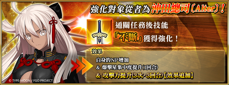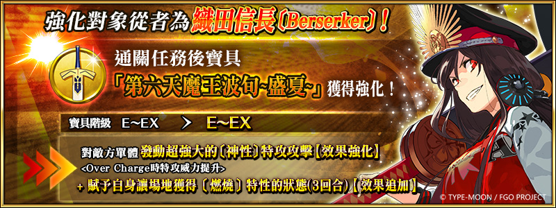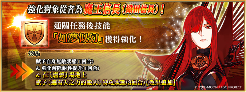 自2021年12月30日(四)維護後起,將永久追加「★5(SSR)魔王信長(織田信長)」、「★5(SSR)沖田總司〔Alter〕」及「★4(SR)織田信長〔Berserker〕」等3騎從者的「強化任務」,御主們前往迦勒底之門通關任務,強化對象從者的同時,更能獲得聖晶石獎勵。