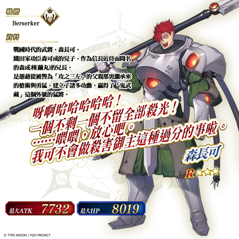 登場從者 ★5(SSR)魔王信長(織田信長) | 登場從者 ★5(SSR)沖田總司〔Alter〕 | 登場從者 ★5(SSR)李書文〔Assassin〕 | 登場從者 ★4(SR)織田信長〔Berserker〕 | 登場從者 ★3(R)森長可 |