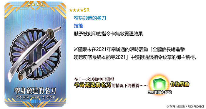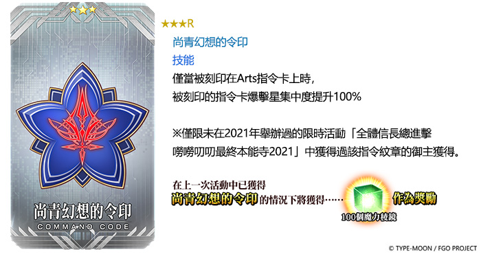 先前未曾獲得過「★5(SSR)尾張的大傻瓜」、「★4(SR)窄身鍛造的名刀」及「★3(R)尚青幻想的令印」等三款活動獎勵指令紋章的御主,本次復刻活動可以透過通關任務獲得;曾獲得過的御主,將以稀有魔力稜鏡或魔力稜鏡作為獎勵。當累計獲得6騎以上的「★4(SR)長尾景虎」時,從獲得第6騎時起,每獲得1騎,即可得到1個稀有魔力稜鏡(發送至禮物盒)。
