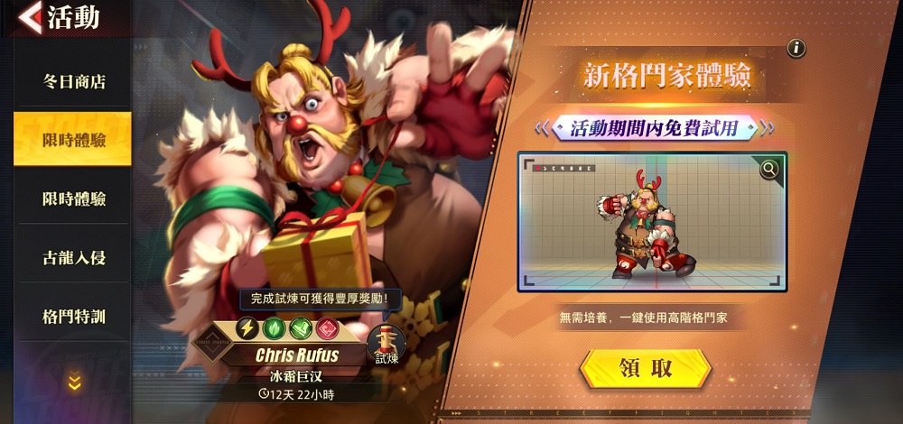 同時玩家可限時14天體驗新角色Chris Rufus,活動期間免費一鍵使用高階格鬥家,加入玩家自己的陣容中。Chris Rufus擁有範圍傷害技能,還可附加對手冰霜狀態,配合連招能夠減速或冰凍對手,後續接我方格鬥家收割,是雷鳴陣營的強力輔助角色。