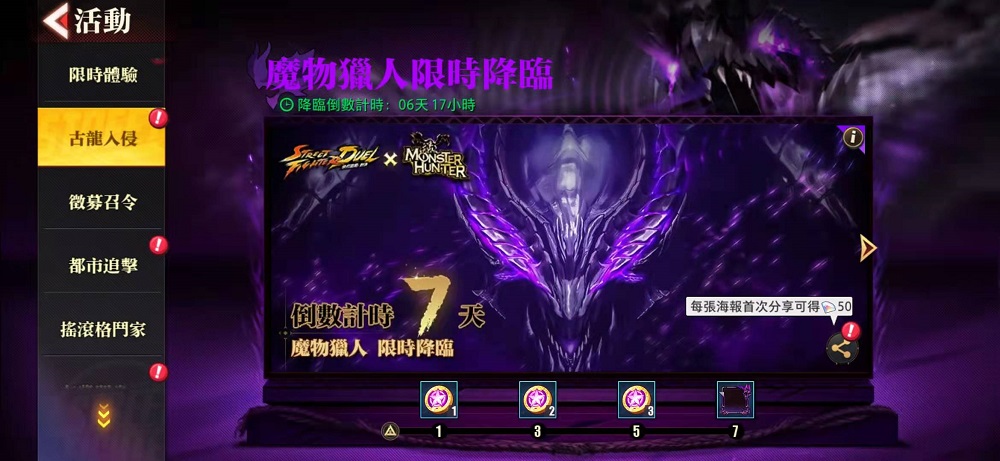 《快打旋風:對決》X《魔物獵人》聯動活動已正式開啟倒數預熱活動,玩家每日登入遊戲分享海報可獲得街機幣和聊天氣泡獎勵。除此之外,玩家還可通過海報獲得關於此次聯動活動的線索(https://www.facebook.com/StreetFighterDuelTW/posts/206248245045817)。據悉,官方將在12月27日晚7點舉辦遊戲代言人神秘舞台,並釋出此次魔物獵人聯動版本內容訊息,敬請關注。