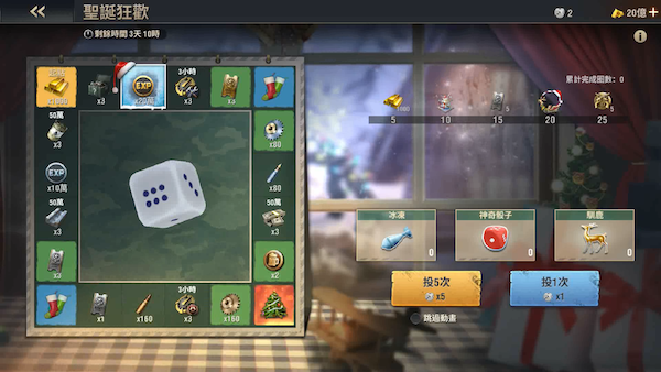 進攻黑鴉營地蒐集骰子,再擲骰子依照點數前進,獲得多樣幸運好禮。善用「冰凍」、「神奇骰子」、「馴鹿」三種魔法道具,可以幫助玩家走到特定格子上,領取您心儀的道具。走到聖誕襪或聖誕樹格子,還能觸發「機遇」和「命運」,贏得額外的特殊獎勵。