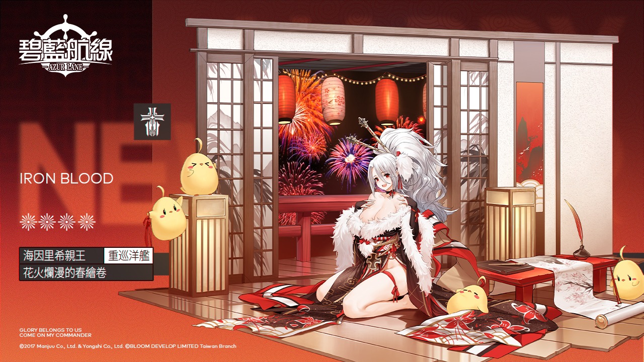彼得·史特拉塞【節慶的Chronos】L2D、讓·巴爾【舶刀Première neige】L2D、黎胥留【常綠Rêve prophétique】L2D、海因里希親王【花火浪漫的春繪卷】、U-37【輕彈淺唱正月時】、紐倫堡【正月的漫遊】、威悉【暗金綉色】、Z24【「魔王」的祝祭!】、Z28【新年大雜燴!】、奧丁【揮毫蒼雪】、榛名【雅緻蓮華】、鐵必制【松之節句、白之冰華】、涼月【新年羽板球大戰!】、比洛克西【絢爛繽紛花火夜】、貝爾法斯特【傾城之華扇】、喬治亞【雅色彩華】、香檳【初夢藍彩】、朝潮【雪潮與鈴】、U-110【小鯊魚的初夢】、南安普敦【新年的LittleKnight】、復刻-長門【御狐的輝振袖】、復刻-響【正月的小惡魔】、復刻-龍鳳【鳳舞新年】L2D、復刻-Z35【Projekt Kirschblüte】、復刻-霧島【隨性的閃耀之星】、復刻-霞【新年暖洋洋】、復刻-能代【祭典的秘境?】L2D、復刻-駿河【百花慶雲】L2D、復刻-腓特烈大帝【雅樂的黯衣】、復刻-綾波【新年的願望】、復刻-皇家方舟【新年的守護者】、復刻-獨角獸【祈願的雪與梅】、復刻-克里夫蘭【新年對決!】換裝限時上架。