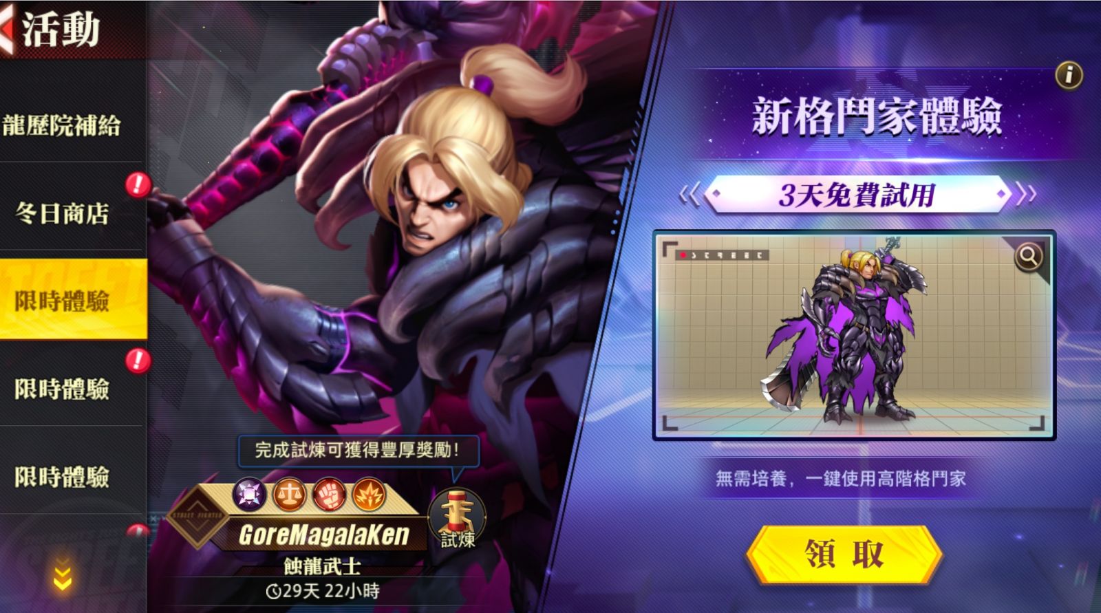 《快打旋風:對決》X《魔物獵人》聯動活動期間,玩家可免費體驗Gore Magala Ken三天,將其加入自己的陣容中進行戰鬥。遊戲創作征集活動同步開啟,玩家可圍繞Gore Magala Ken創作創意內容,例如分享自己對角色的配隊思路,角色分析,技能分析,或是有關角色的趣味創作,創意形式不限,將作品發佈到公開平台並投稿即有機會獲得Mycard獎勵(圖文類點讚量和視頻類播放量前10名),精華作品(兩種類別第一名)可獲得Switch大獎。