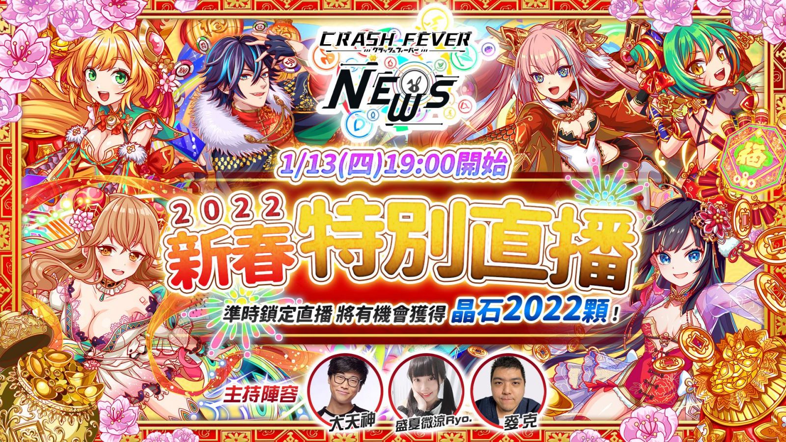 《Crash Fever》2022年新春特別直播將於1/13本週四19:00舉辦! ~直播中將介紹既豐富又豪華的新春期間活動內容! 準時鎖定直播還有可能成為獨得2022晶石紅包的超級幸運兒~