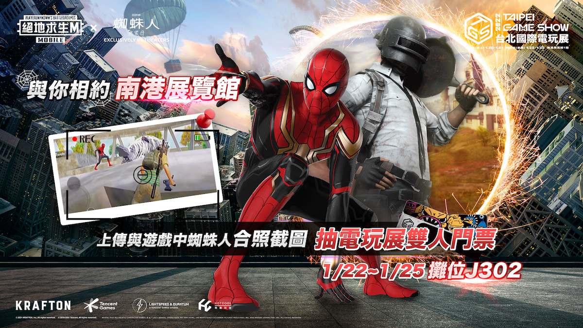 除此之外,即日起至1月19日止,於《PUBG MOBILE : 絕地求生M》官方Facebook粉絲專頁指定活動貼文留言處,上傳遊戲中角色與蜘蛛人的合照截圖,即可免費抽電玩展雙人門票。現場更邀請多位電競實況主,包括統神、貝莉梅、依渟、國動、冠緯、超負荷、小雲寶寶,以及性感Coser 四月桐與玩家近距離互動。想捕捉野生三級盔先生及你的好鄰居蜘蛛人嗎?2022台北國際電玩展與你不見不散!
