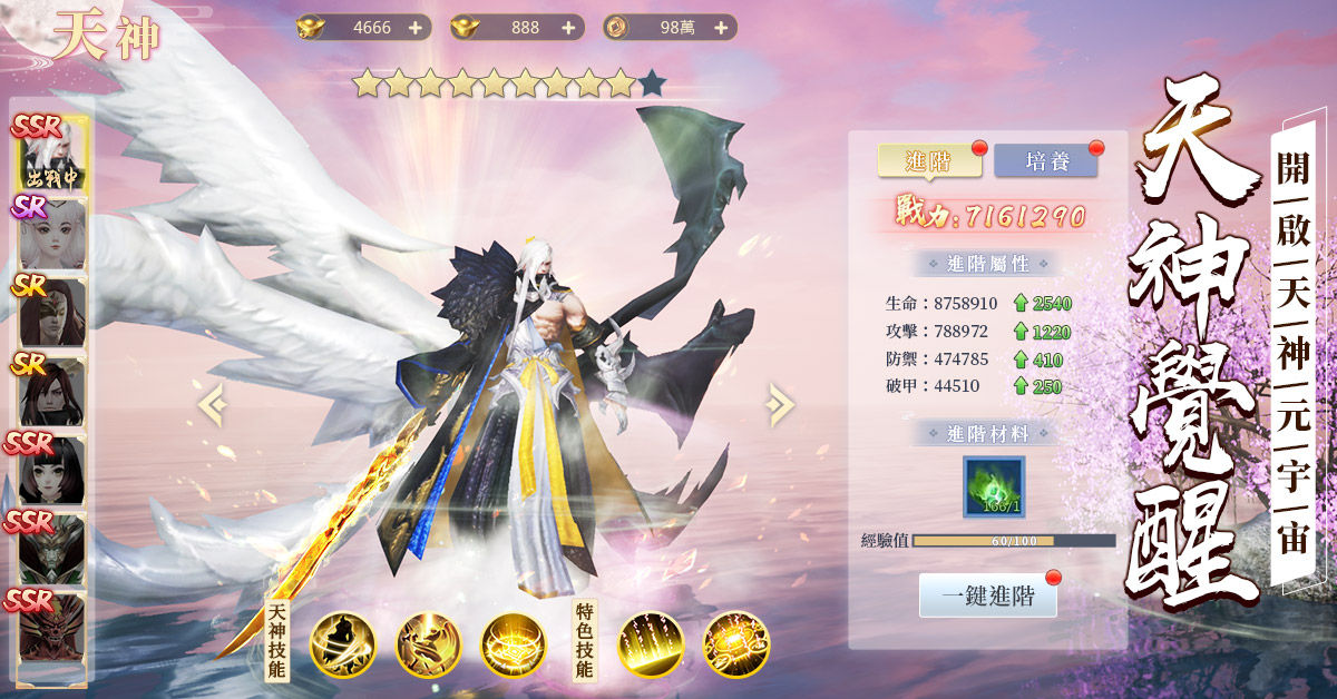 天神副本開啟後,可通過合理放置建築,抵禦邪惡天神入侵,擊殺他們可獲得大量天神材料,在副本中召喚並擊殺召喚的邪惡天神,有更高的概率獲得高品質天神技能;通過天神副本或其他途徑獲得天神碎片,收集滿指定碎片後可召喚強大的天神,每個天神都有自己獨特的天神技能,能極大的提升各位主公的戰鬥力;同時消耗與天神對應五行的神元可以點亮天神神元宇宙,點亮越多,獲得的屬性越多。