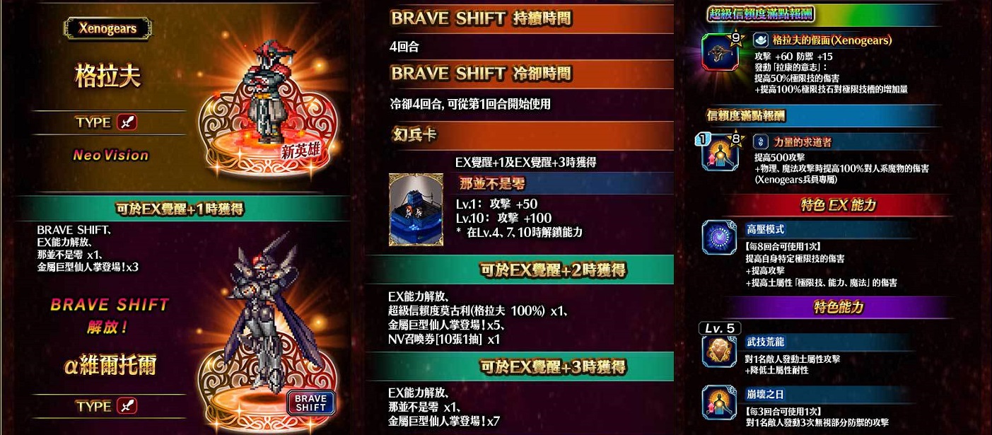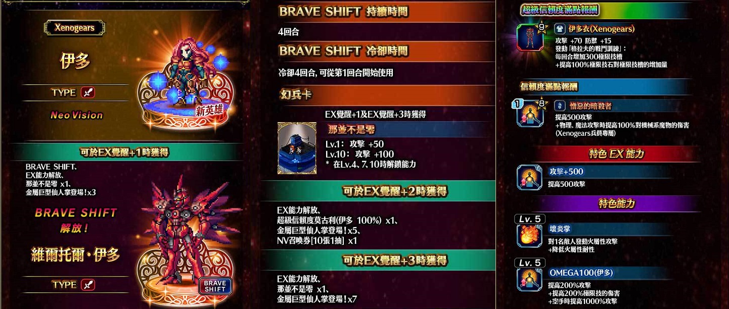 來自《Xenogears》惡名昭彰的敵方角色『伊多』與『格拉夫』參戰!於活動期間您將可透過精選召喚,邀請這兩位強大的NV兵員加入您的隊伍!此外,廣受玩家喜愛的新NV覺醒解放兵員『飛』,也已經踏上冒險的征途!