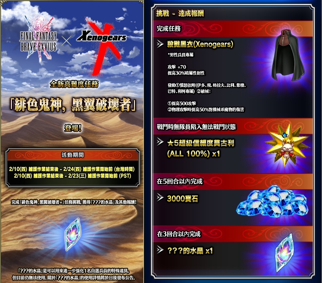 ●全新高難度任務「緋色鬼神,黑翼破壞者」:只要挑戰全新的高難度任務,完成所有任務的勇者將可獲得額外的活動專屬報酬,包含「殺戮黑衣(Xenogears) 」與一個稀有的神祕水晶。
