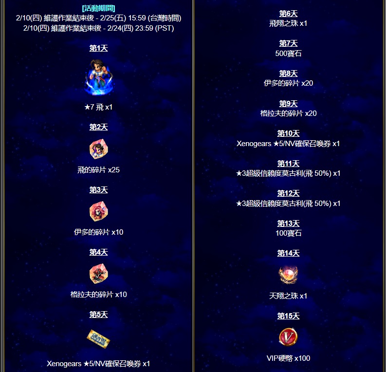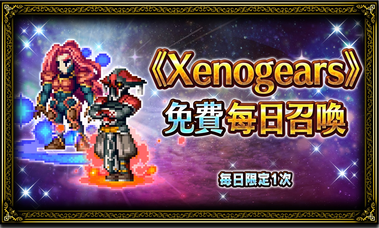 ●「《Xenogears》免費每日召喚」:即日起至2/24活動時間結束止,玩家每日可以免費進行一次確保Xenogears兵員的召喚。