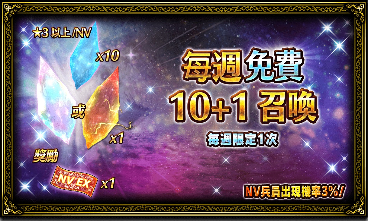 ●「每週免費10+1召喚」:即日起至4/28活動時間止,玩家每週可以進行一次免費的10+1召喚,每次召喚皆可額外獲得一張「NV召喚券[10張1抽] 」。