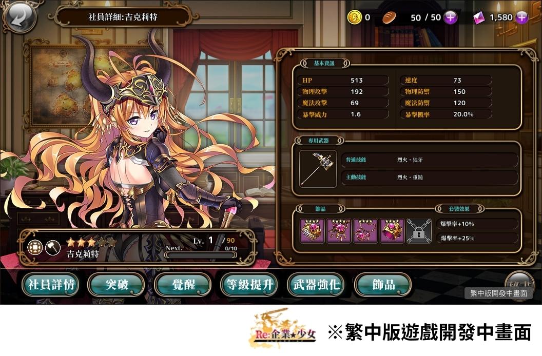 以上就是這次的遊戲畫面搶先看,除了可以看到畫面易懂之外,玩家們有沒有發現介面整體按鍵都偏向右邊,這樣不管是通勤還是認真遊玩,都可以好好使用慣用手啦!貼心的設計再加上狀態跟詳細描述欄位都更加好懂易讀,更重要的是,《Re:企業★少女》是特別針對台灣玩家所設計的繁體中文版,讓玩家更容易沉浸在劇情中,再也不會有看不懂故事的情況發生囉!