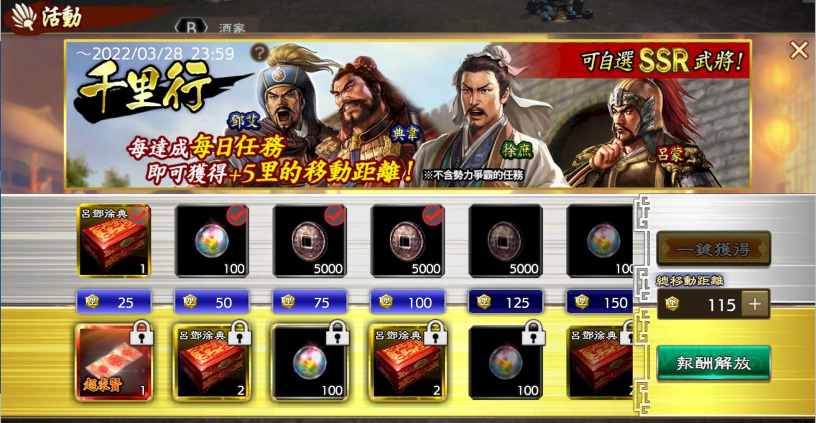復刻版千里行,玩家們可從已登場的四位千里行武將(鄧艾・典韋・徐庶・呂蒙)中選擇自己想獲得的武將。