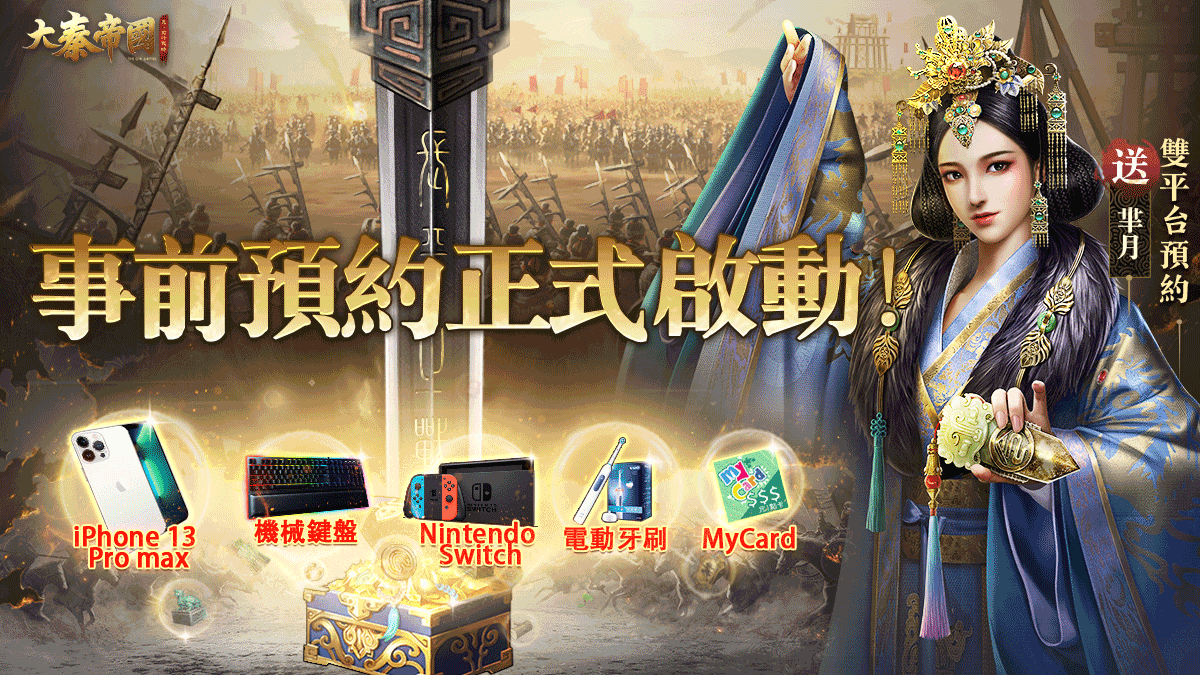 為了歡慶《大秦帝國》事前預約正式展開,官方也準備了諸多好禮贈送玩家喔。即日起只要在官方粉絲團中的指定貼文中參與活動,分享並標註2名好友,並成功於留言區留下雙平台預約成功的截圖,就能參與各種實體獎勵的抽獎,獎勵包含「iPhone 13 Pro Max」、「 雷蛇機械鍵盤」、「 Nintendo Switch」、「 電動牙刷」以及「 Mycard點數」等豐富好禮!喜歡SLG即時戰略類型遊戲的你/妳,現在就快加入《大秦帝國》的事前預約,一同打造屬於自己的輝煌時代吧!