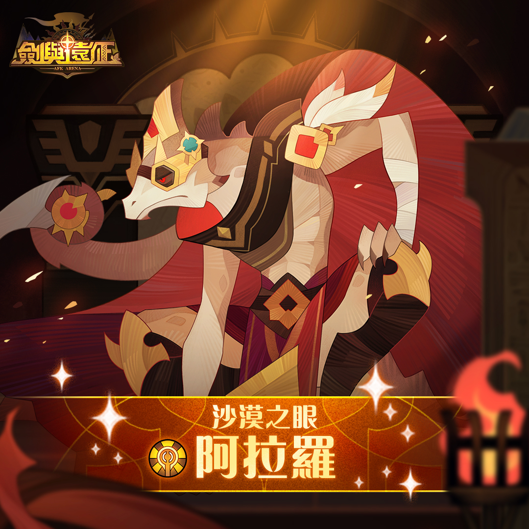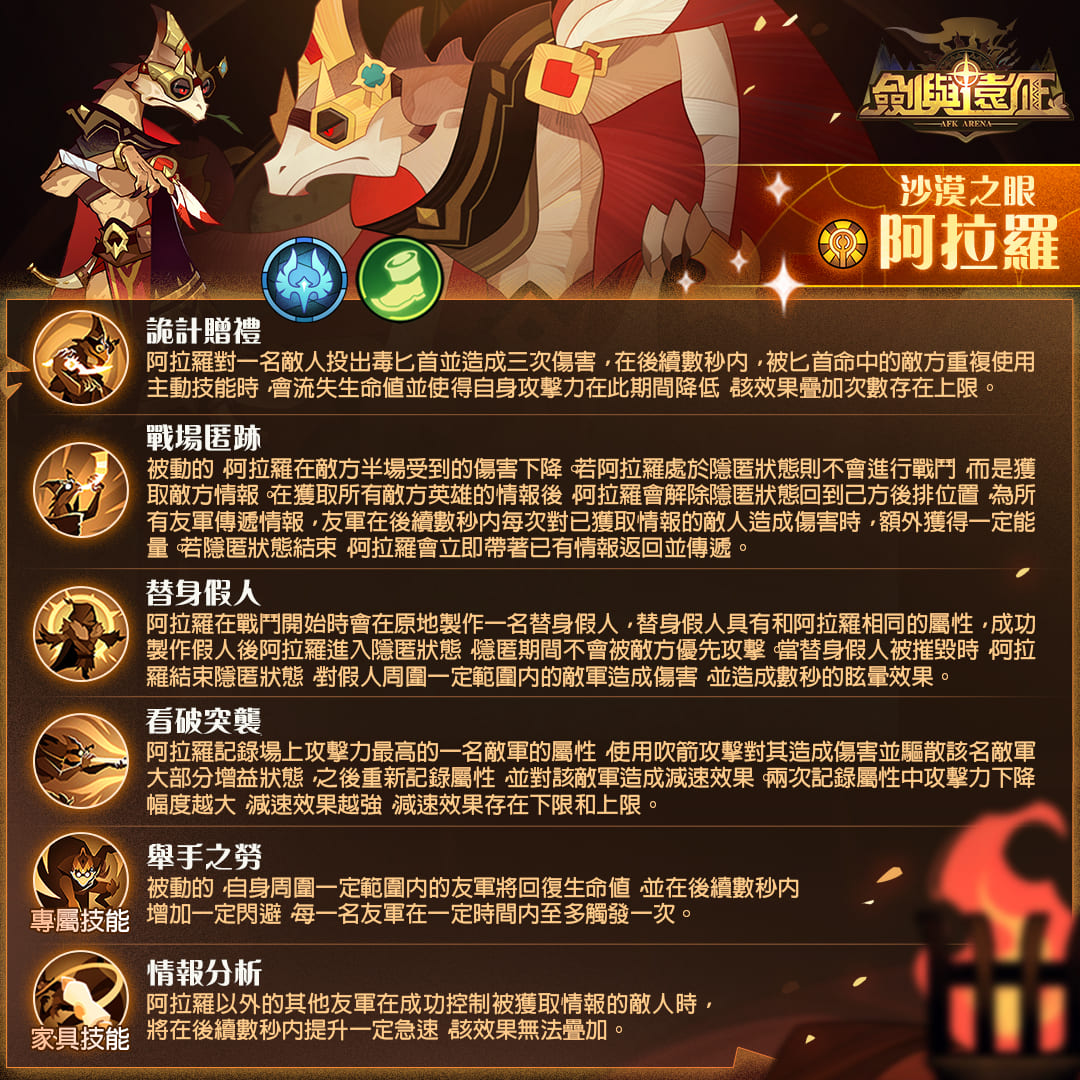 『沙漠之眼-阿拉羅』是蠻血部族的偵察兵,能夠隱匿自身潛入敵陣蒐集情報,為友軍提供額外能量。阿拉羅也擅長投擲毒匕首和吹箭,製造輸出的同時還能削弱敵方攻擊力,驅散對手增益效果,施加減速狀態,令隊友在戰場上獲得更多優勢,是蠻血陣營不可或缺的輔助英雄。