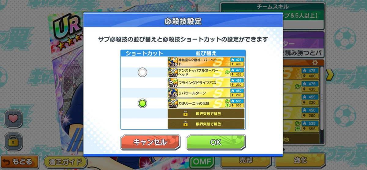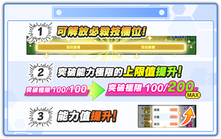 此外,透過進行「超越極限」,除了可以「解放必殺技欄位」、「增加突破能力極限的上限值」外,還能增加球員「能力值」。