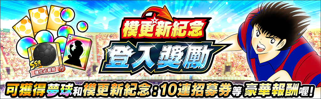 將舉行「模更新紀念10連票券招募」特別的招募活動!招募券可透過「模更新紀念登入獎勵」取得,根據玩家登入的天數,最多可獲得150連的招募券!此外,招募將以層級攀升的形式進行,在 step 1、step 4可確定獲得1名SSR球員!