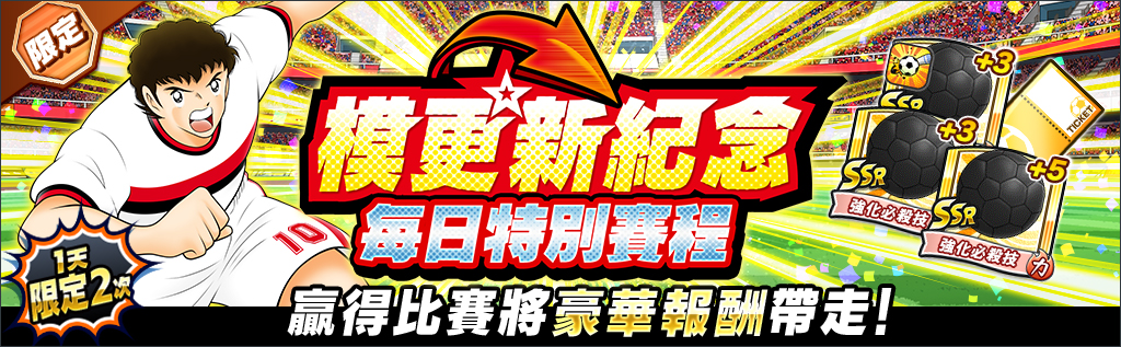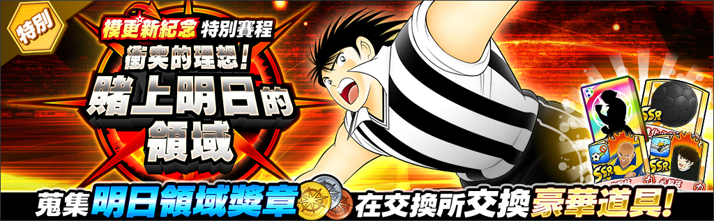 完成關卡即可獲得「明日領域獎」,收集獎章除了可至交換所兌換「SSR確定招募券」和「夢幻彩星缽招募券」外,還可兌換「極限突破還原券」、「[必殺技等級S]強力鏟球(羅伯特・本鄉)」、「[必殺技等級S]強硬斷球(托朗)」等豪華獎勵!