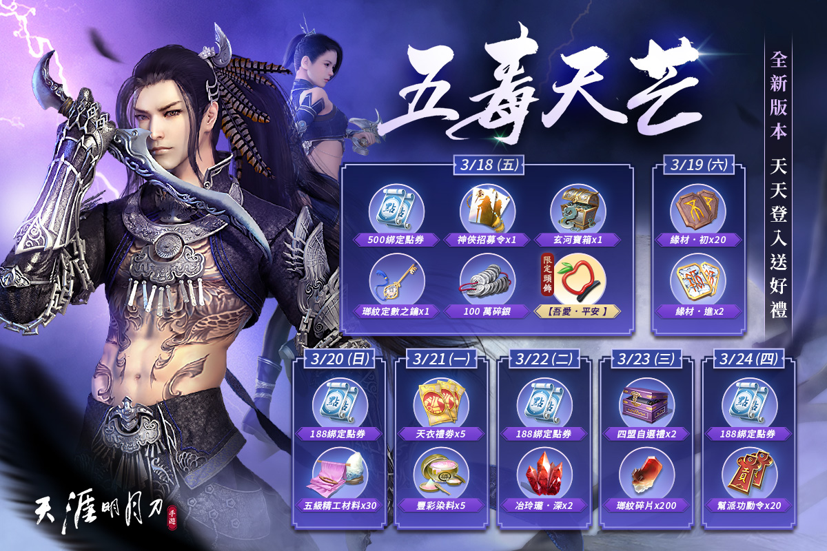 在『五毒天芒』版本中,除了釋出全新挑戰玩法「天芒秘令」,也將開放全新話本「浪客營」與挑戰話本「會八峰」,玩家們將在浪客營中正面迎戰來襲中原的東瀛武士「霧隱雷藏」;並前往秦川天峰一戰真武掌門「笑道人」及《天涯明月刀 M 》代表人物「阿暖」,挑戰成功將可獲得絕品裝備、神品飾品與武器配飾…等眾多豐富獎勵。