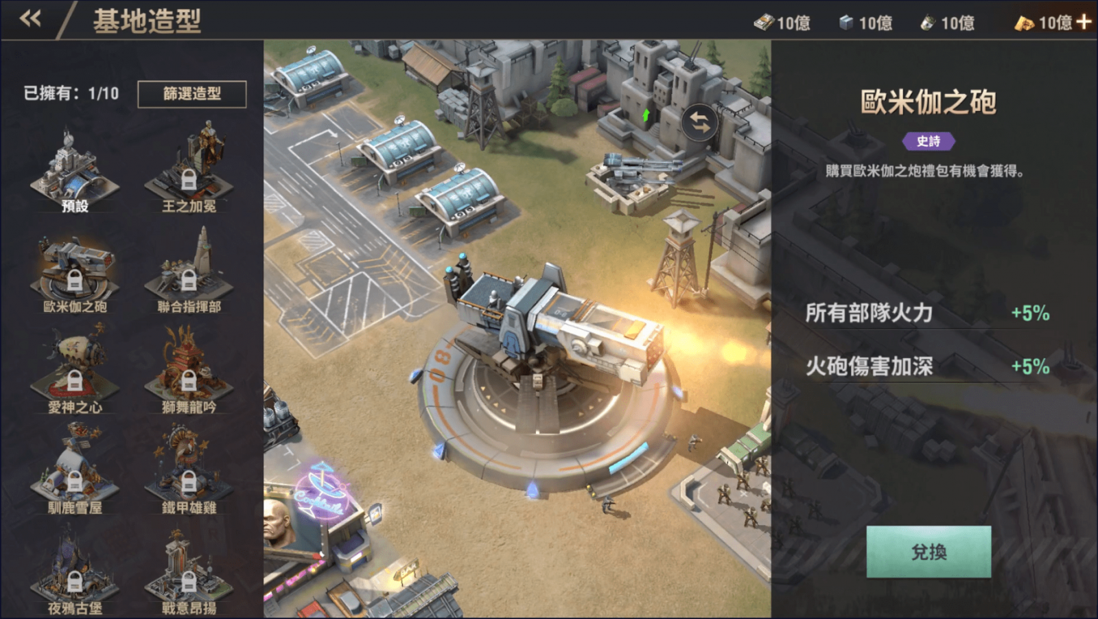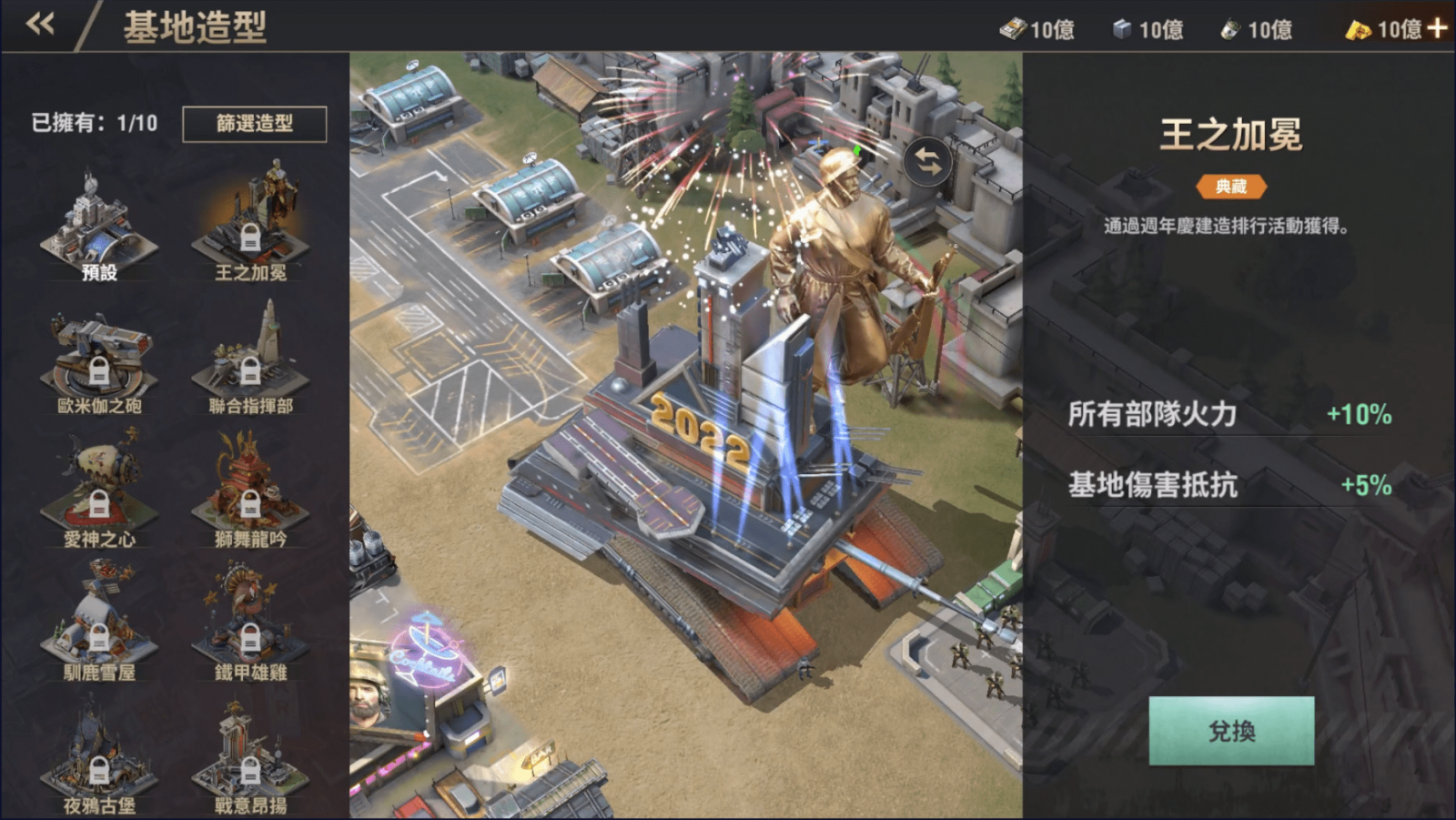 歡慶全球一週年,三款週年限定基地造型隆重登場!參與週年活動就有機會獲得典藏造型「王之加冕」,以及紀念造型「聯合指揮部」。除此之外還有史詩造型「歐米伽之砲」,讓總指揮部化身最強秘密武器吧。