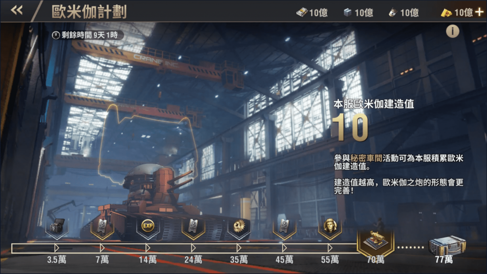 與全服指揮官同心協力累積歐米伽建造值,打造秘密武器歐米伽之砲。建造值一旦達到指定門檻,伺服器內所有玩家都能領取活動獎勵,建造值愈高就解鎖愈多大獎。