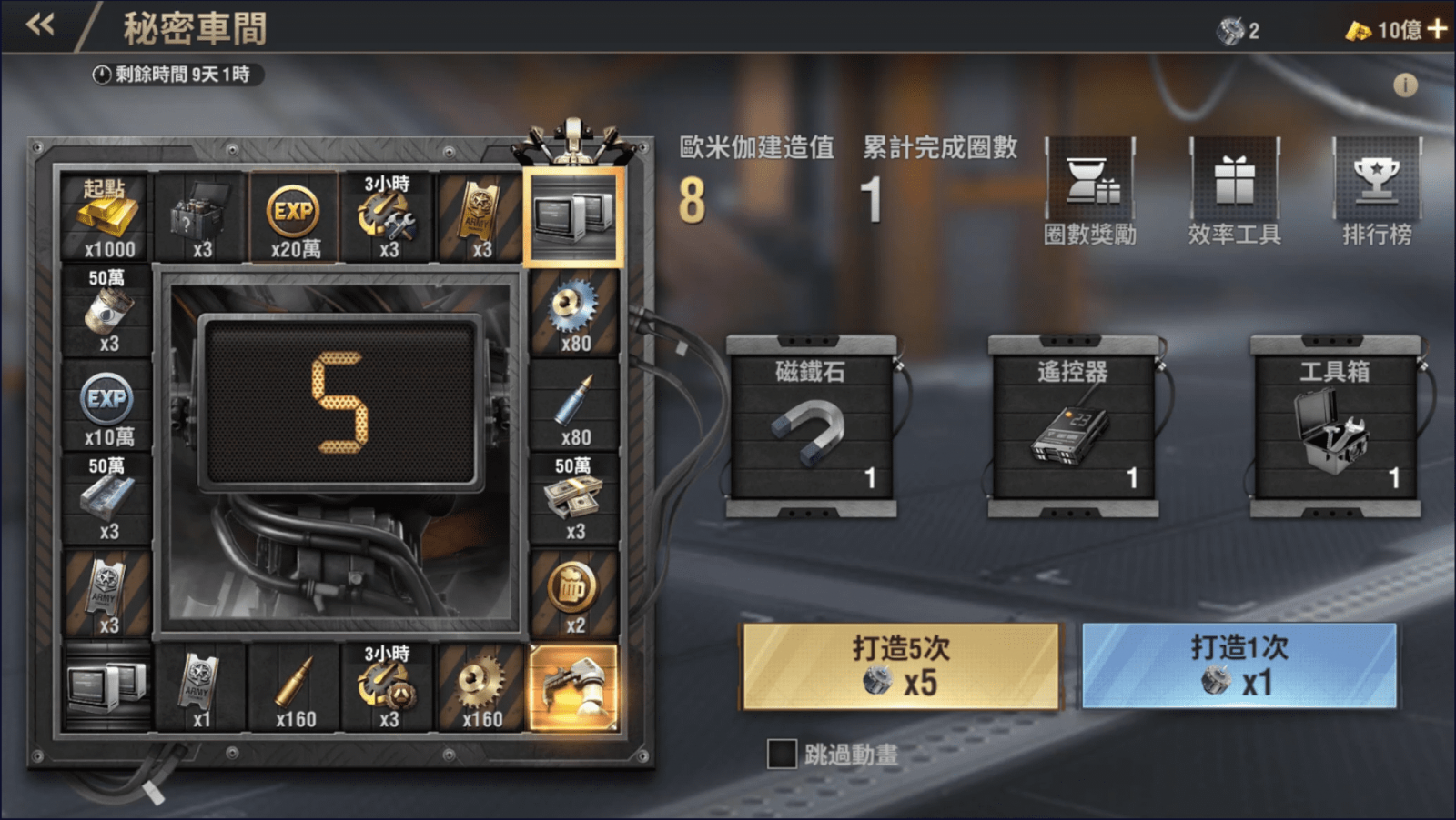 使用「核芯」在格子上前進,獲得豐富幸運好禮,累積歐米伽建造值。善用三種高效工具「磁鐵石」、「遙控器」與「工具箱」,可以幫助指揮官獲得心儀的獎勵,並加快歐米伽建造值累積速度。