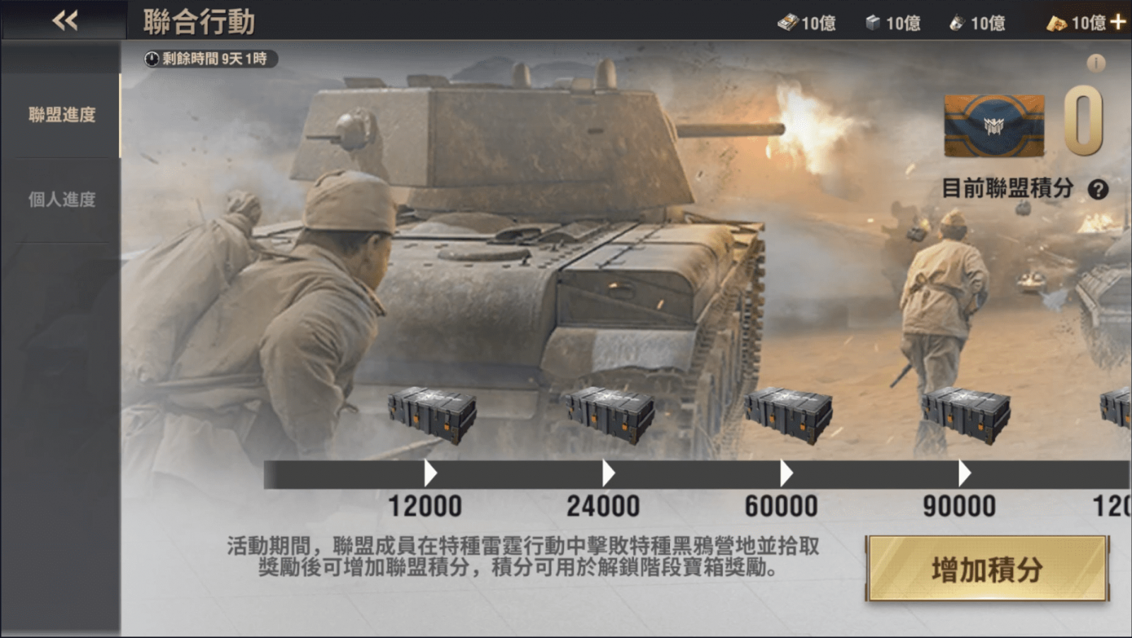 在特種雷霆行動中進攻黑鴉營地,累積聯盟積分與個人積分,領取雙重寶箱獎勵,積分愈高獎勵就愈豐富喔!