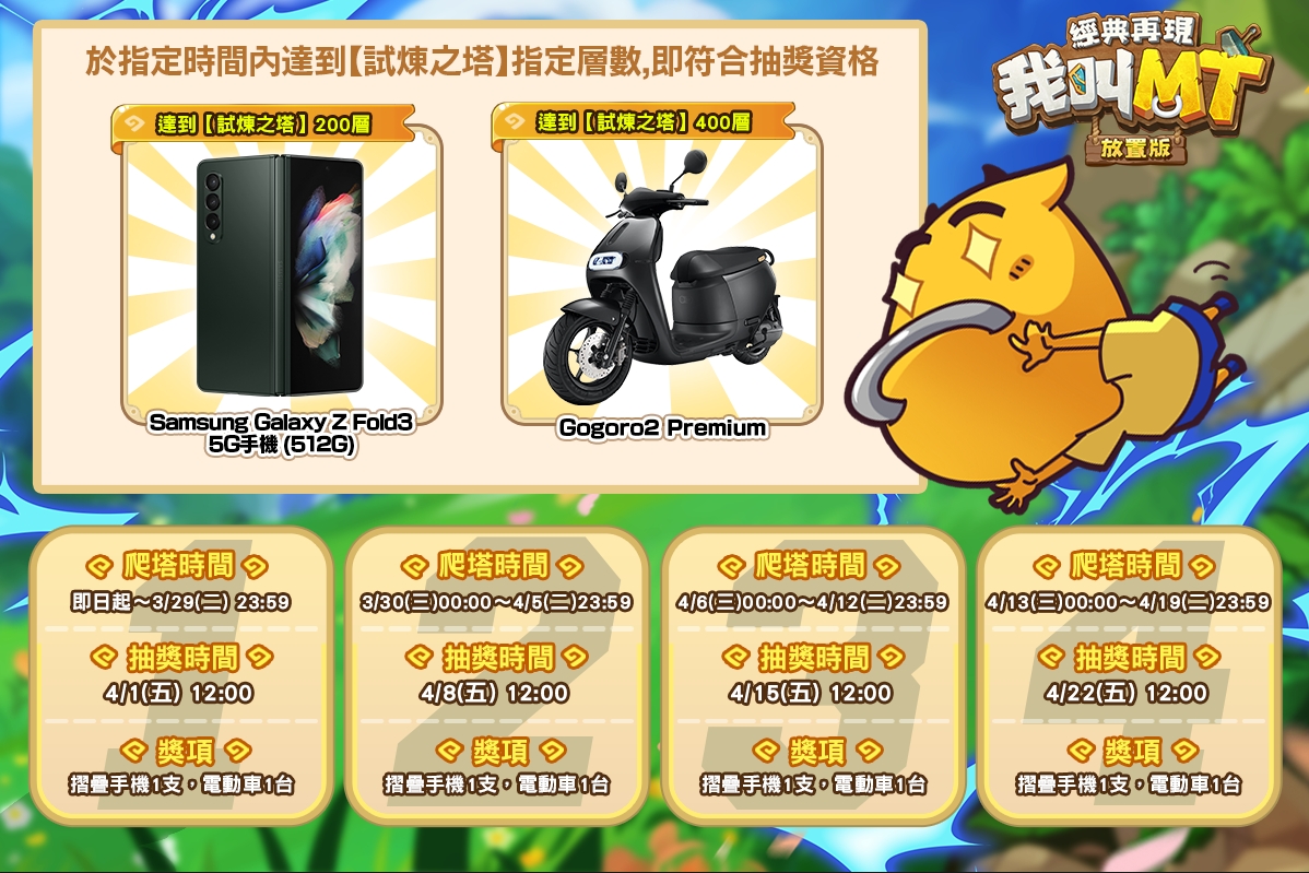 《我叫MT:經典再現》誠意滿滿,給玩家輕鬆沒負擔的遊戲體驗外,更是連續四周大方週週送,即日起至4月20日止只要挑戰試煉之塔達200層就符合「Samsung Galaxy Z摺疊手機」抽獎資格;達400層則可以抽「Gogoro電動機車」,雙機放送活動等你挑戰!