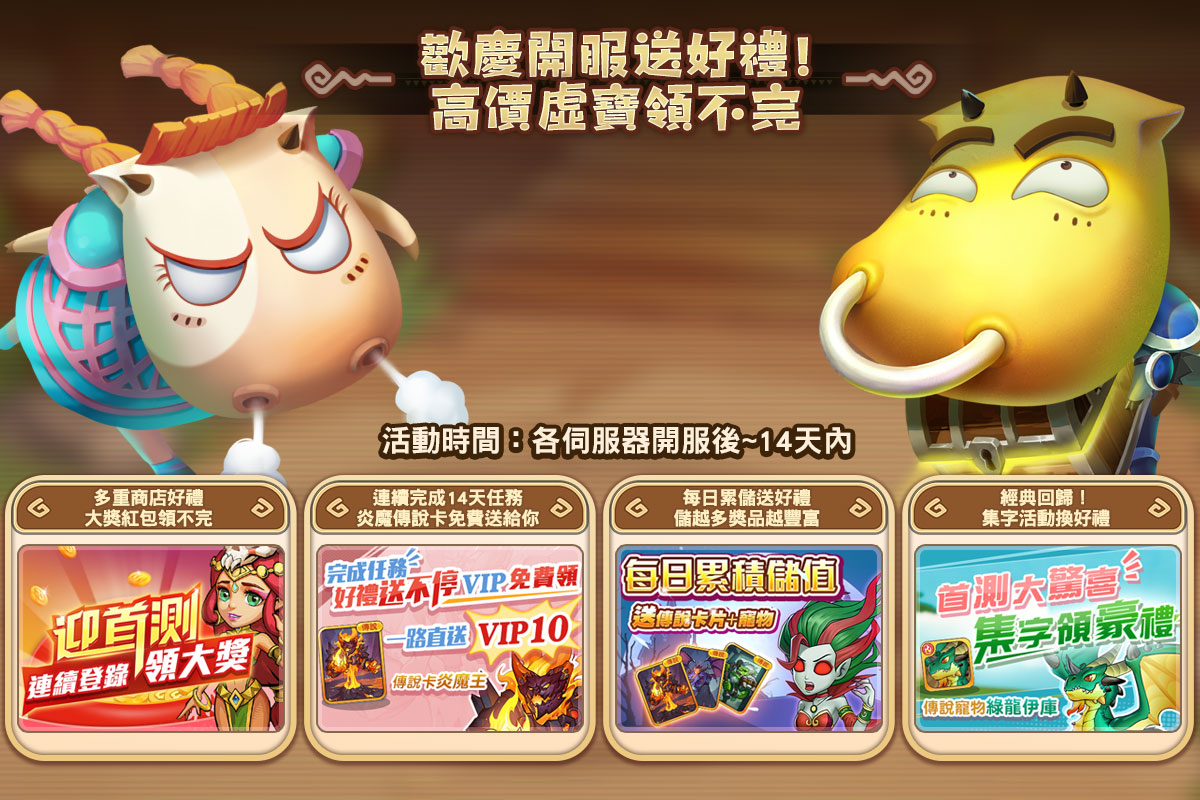 歡慶開服一系列活動開跑!即刻起至4月5日止,遊戲連續登入7天就送豐富道具,包含VIP碎片、傳說炎魔王卡片,傳說寵物「大小姐」、開服紅包高級禮盒;連續登入14天加碼送傳說寵物「熔岩巨獸」、「萬靈狂想」頭像框等多項豪禮!