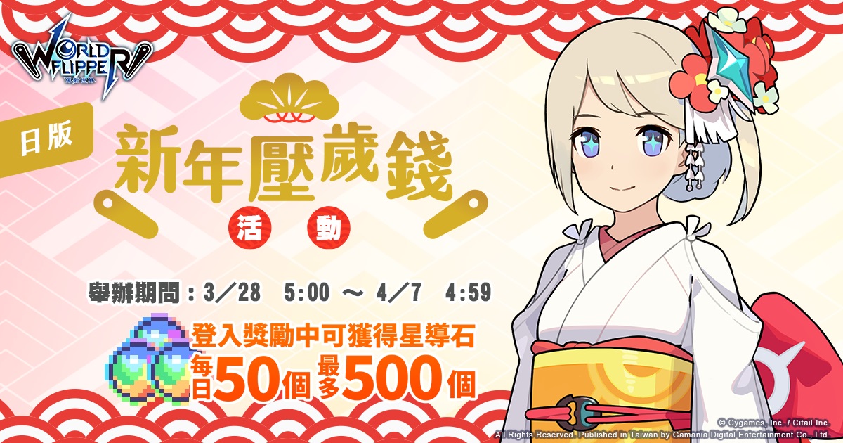 【遊戲內新年壓歲錢活動】於3月28日05:00至4月7日04:59,活動期間內登入,每日可獲得50個星導石,最多可獲得500個星導石!