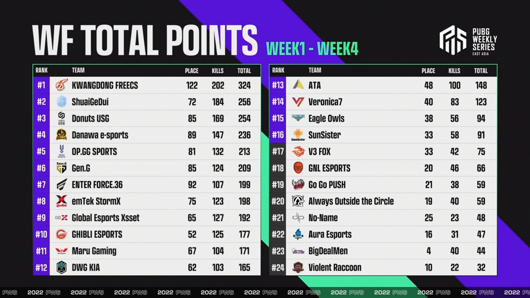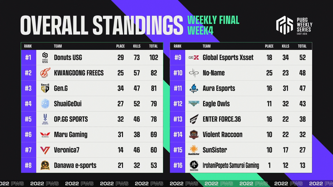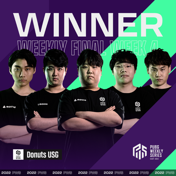 2022 年 04 月 01 日 (五),台北 – KRAFTON, Inc. 旗下工作室 PUBG Studios 知名作品《絕地求生》(PUBG: BATTLEGROUNDS,以下簡稱 PUBG) 由台港澳、韓國以及日本等三個賽區聯合舉辦之 2022 PWS 東亞聯賽 (2022 PUBG WEEKLY SERIES: EAST ASIA,以下簡稱 PWS) 於上週末結束第一季每週系列賽事,向來由韓國隊伍稱霸的 PWS 每週決賽,最後一週賽果跌破眾人眼鏡,由來自日本賽區的 Donuts USG (USG) 以 102 分勇奪週冠,成為 2021 年 PWS 東亞聯賽開賽以來,第一支非韓國的週冠軍隊伍!最終總決賽將集結來自台港澳的 Global Esports Xsset (GEX) 和 ShuaiGeDui (SD) 等 16 支台日韓隊伍,於下週四 (4/7) 跨海開打!
