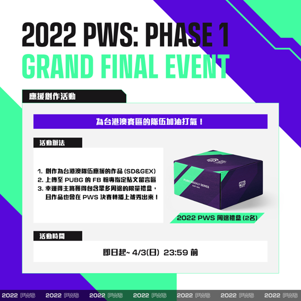為了讓粉絲能更直接地應援各自賽區的隊伍,PUBG 台港澳臉書粉絲團目前正舉辦應援創作活動,即日起至本週日 (4/3) 止,只要在 官方臉書粉絲團指定貼文 下方上傳為台港澳隊伍 SD 與 GEX 加油的創作作品,就有機會把 PWS 精美週邊帶回家!