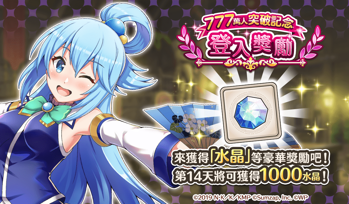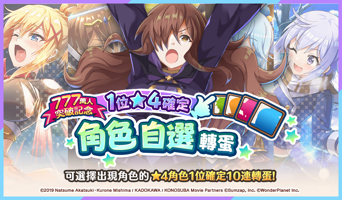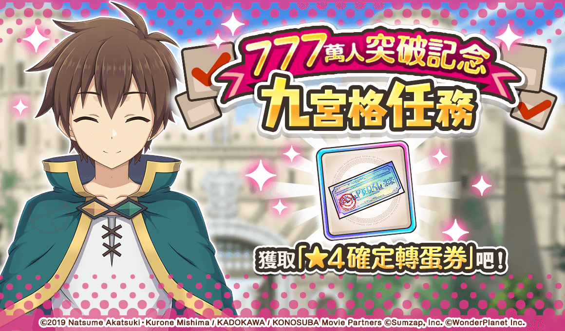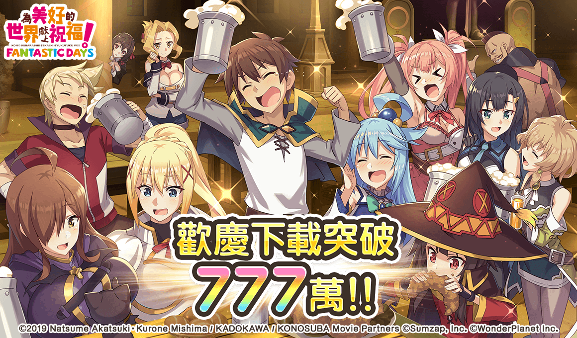 致力發展數位娛樂服務的 WonderPlanet Inc. (所在地:日本,總公司:愛知縣名古屋市,CEO:常川友樹,東證Growth:證券代碼4199,以下簡稱「本公司」),由本公司發行及營運,改編自人氣動畫『為美好的世界獻上祝福!』首款手機遊戲『為美好的世界獻上祝福!Fantastic Days』(以下簡稱『美好世界FD』),將於2022年4月21日(四)起舉辦「下載突破 777 萬人紀念活動 」,特此告知。