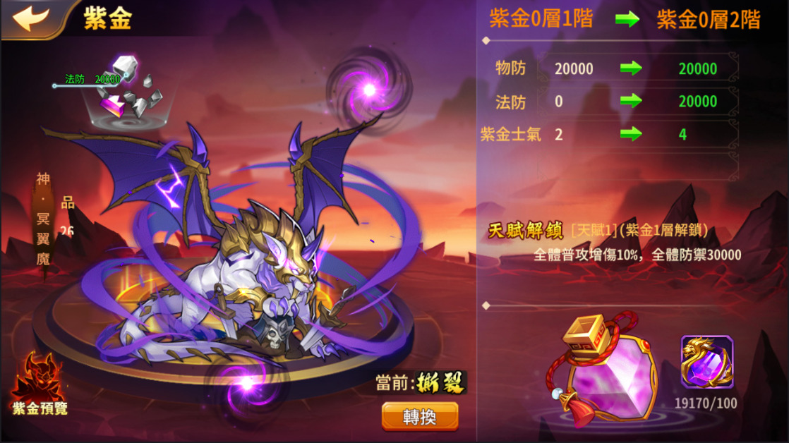 主公等級達到135級,且寵物達到100級並升到暗金後可升紫金。晉升紫金需要消耗道具「寵物紫金靈」與「寵物本體」,寵物紫金靈可在過關斬將中的斬將試煉關卡中獲得。紫金寵物養成共有3大階段,每階段有 8 個等級,每級都將增加紫金屬性,完成各階段培養可解鎖強力的路線天賦。