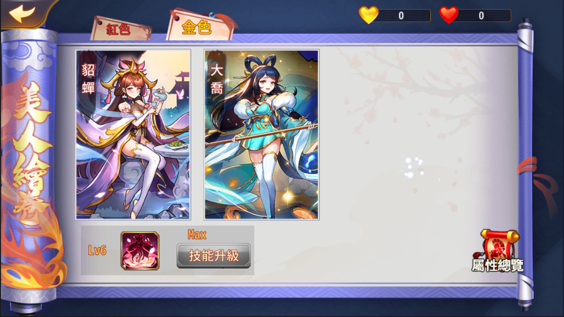 美人繪卷功能新添「貂蟬、大喬」兩位金色品質的美人,玩家可透過繪卷碎片啟動與培養美人,以提升基礎屬性、全體屬性及獲得魅力值,新加入的金色美人繪卷技能則需消耗金色魅力值啟動及升級,啟動後可與紅色美人繪卷技能同時使用。